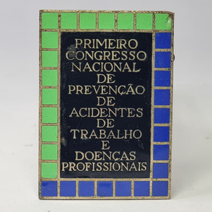 Crachá esmaltado do Primeiro Congresso Nacional de Prevenção de Acidentes de Trabalho e Doenças Profissionais. Dim.- 4,7 x 3,3cm.