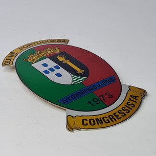 Raro crachá de grande dimensão, em alumínio, Guiné Portuguesa, IV Congresso do Povo, 1973. Congressista. Altura- 9cm.