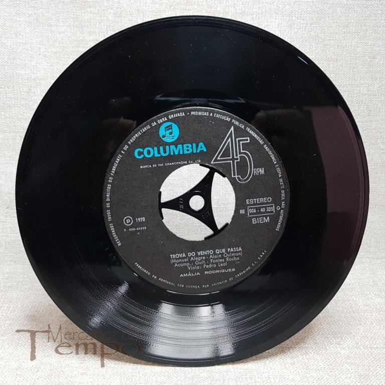 Disco 45rpm Amália Rodrigues – Trova do vento que passa, Manuel Alegre – Alain Oulman. Capa com sinais de uso, com um vinco na abertura onde entra o disco, com um bocadinho de fita cola atrás e sinal de ter tido um pequeno autocolante, alguma sujidade. Disco em bom estado com ligeiríssima falha no bordo.