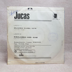 Disco 45rpm Jucas – Muxima Kuiba - Merengue – MPA – 4038 – CD. Capa em bom estado, com sinais de uso, pequena assinatura de posse atrás e carimbo das produções Luanda. Disco em bom estado.