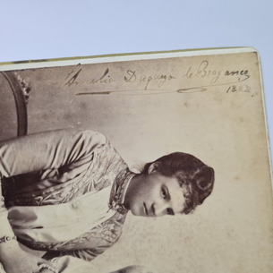 Fotografia CDV do Atelier A.Fillon com a Duquesa D.Amélia de Bragança e o filho, o Principe Real Luis Filipe, assinatura original da Duquesa D.Amélia e datada de 1888. Alfred Fillon fixou-se inicialmente na cidade do Porto, em 1857, transferindo-se para Lisboa em 1859. Em Lisboa abriu um estúdio de fotografia que manteve até ao final da vida. Fillon retratou a elite portuguesa do tempo, sendo o retratista de eleição da casa real portuguesa. Dim.- 18,2 x 10,8cm.