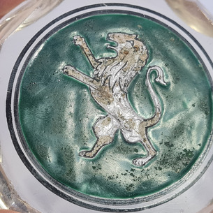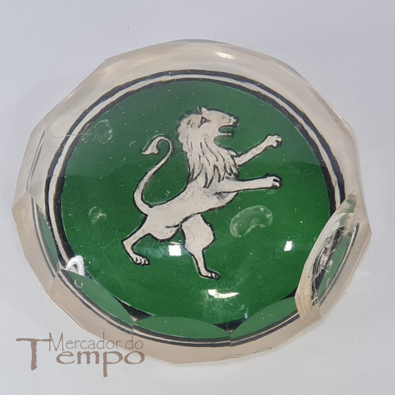 Raro Pisa Papeis com simbolo antigo do Sporting, pintado com tinta de esmalte com Leão gravado no esmalte e pintado. Penso que possa ser datado entre os anos 30/50. Com algumas falhas no vidro. Diam.- 8cm