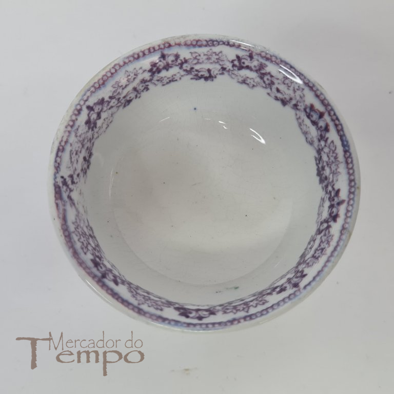 Invulgar Saleiro, em loiça provávelmente de fabrico Inglês (Davenport ?), sem marcas, decoração de flores lilazes. Com craquelé. Alt.- 5cm; Diam.- 7,5cm.