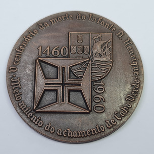 Medalha em bronze comemorativa do V Centenário da morte do Infante D. Henrique, 1460 – 1960, Cabo Verde, festival Náutico de S. Vicente, 1960. Diam.- 3,5cm.