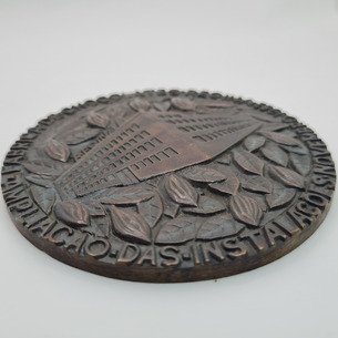 Grande medalhão em bronze Fábrica de Chocolates Regina, ampliação das instalações, 1963. Diam.- 10,5cm. Peso - 408g.