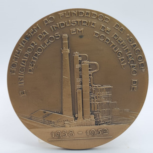 Medalha em bronze Martin Sain, funador da SACOR, assinada: João da Silva, datada de 1952. Diam.- 9cm.
