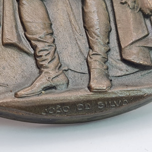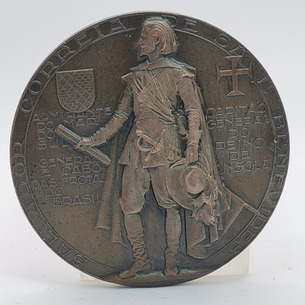 Medalha em bronze comemorativa do III Centenário da Libertação de Angola, com figura de Salvador Correia de Sá e Benevides. Datada de 1948, assinada: João da Silva. Diam.- 8cm.