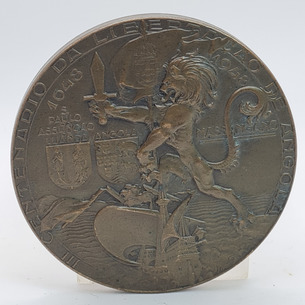 Medalha em bronze comemorativa do III Centenário da Libertação de Angola, com figura de Salvador ...