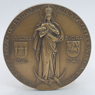 Medalha em bronze Nª Srª da Conceição / D. João IV Duque de Bragança, datada de 1946. Assinada: João da Silva. Diam.- 8cm.