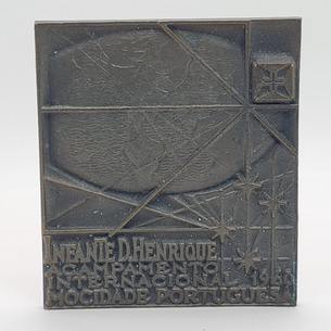 Mocidade Portuguesa, grande medalha em bronze comemorativa do Acampamento Internacional Infante D.Henrique, 1960. Dim.- 8,5 x 7,5cm.