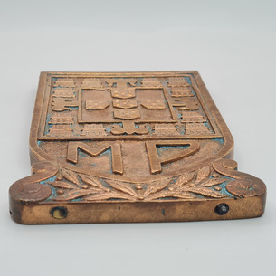Grande Placa em bronze da Mocidade Portuguesa, com gravação atrás 1952- 1953. Teria uma base em mármore ou em madeira. Dim.- 12,5 x 8cm.
