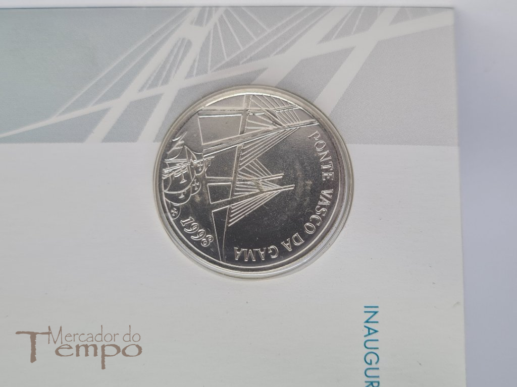 Envelope com carimbo e selo de 1º dia, com moeda de 500 escudos em prata, comemorativo da Inauguração da Ponte Vasco da gama em 1998.